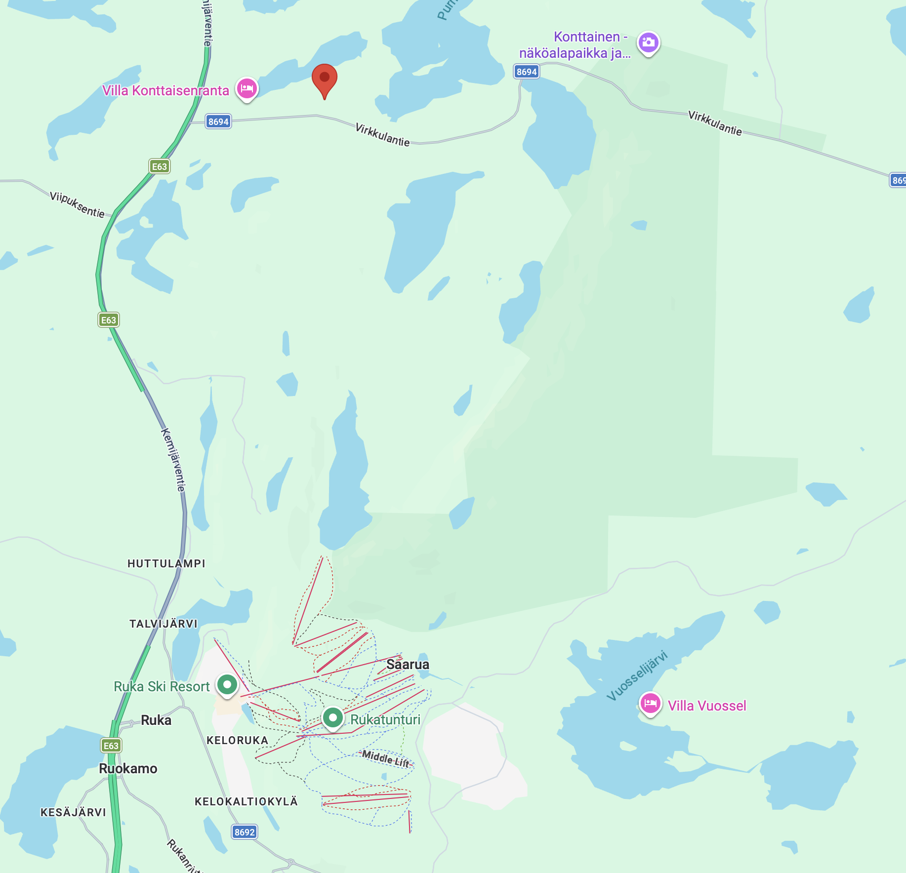 Mökki sijaitsee rauhallisella alueella luonnon keskellä, mutta kuitenkin lyhyen ajomatkan päässä Rukan palveluista. Mökin välittömästä läheisyydestä pääset talvella laduille, sekä kelkkareiteille. Purnujärvi on 700m kävelymatkan päässä. Konttaisen reitti on 3 km päässä ja Oulangan kansallispuistoon Myllykoskelle on 20 km.